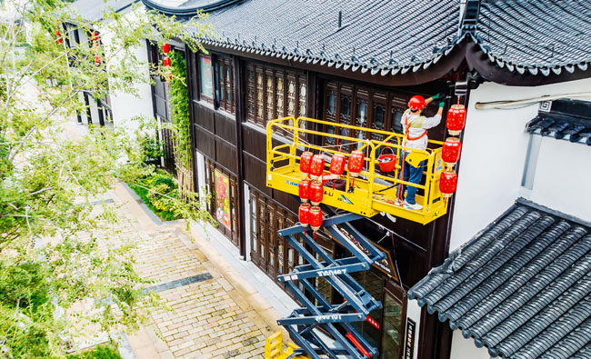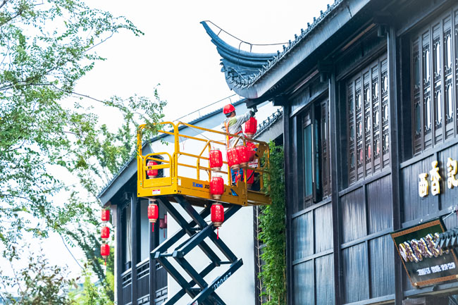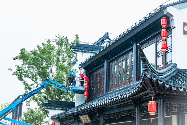 2023年9月25日,蘇宿工業(yè)園區(qū)蘇州街,工人們正在掛燈籠,喜迎中秋、國慶雙節(jié)到來。大紅燈籠與白墻青瓦綠樹相映成趣,成為一道靚麗的風(fēng)景線,營造了歡樂、喜慶、祥和的節(jié)日氛圍。