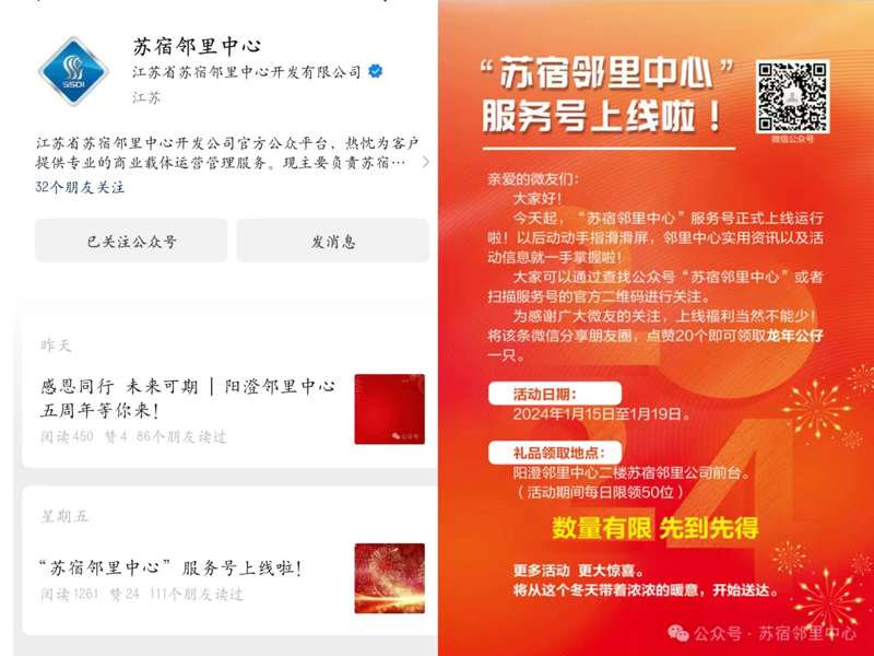 “蘇宿鄰里中心”服務(wù)號(hào),是蘇宿鄰里公司官方賬號(hào),旨在構(gòu)建社群關(guān)系、活動(dòng)宣傳、商鋪招租及有關(guān)政策等方面提供最新資訊,讓載體變得有溫度起來(lái)。