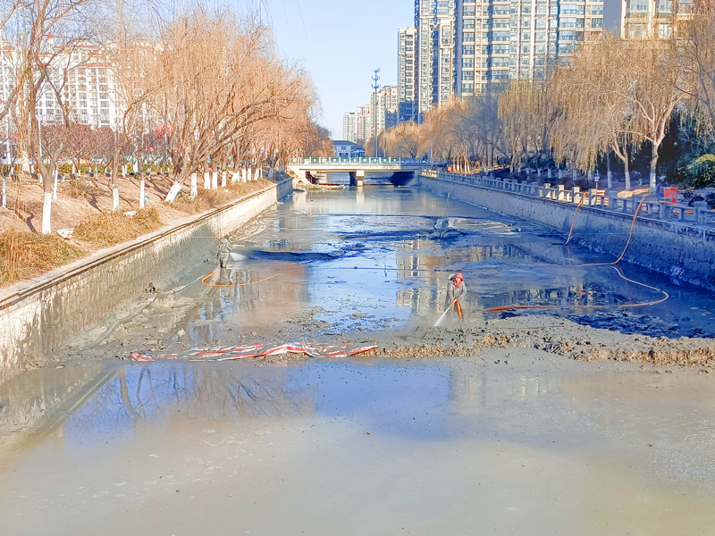 園區(qū)利民河全長1.1公里、寬20米,為區(qū)內(nèi)景觀河。經(jīng)前期摸排,河道內(nèi)淤泥沉積較多,影響河道自凈能力。城發(fā)公司克服冬季氣溫低、斷面長、施工難等不利因素,采用泥漿泵配合高壓水槍射水,管道封閉運(yùn)輸?shù)氖┕し椒?,清理淤泥約8500立方米,高效完成河道清淤工作。