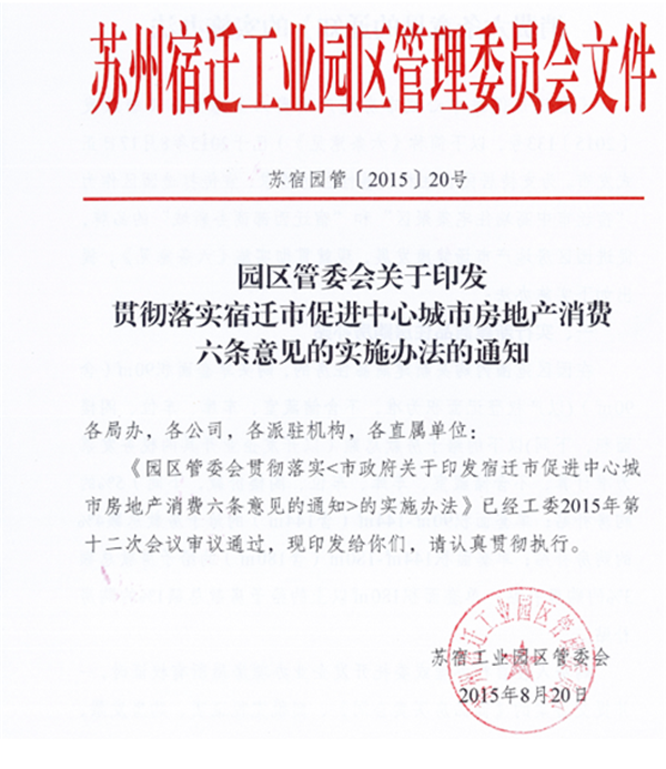 8月20日,在市政府出臺《宿遷市促進中心城市房地產(chǎn)消費六條意見》之后的第三天,園區(qū)率先出臺了《園區(qū)管委會貫徹落實<市政府關于印發(fā)宿遷市促進中心城市房地產(chǎn)消費六條意見的通知>的實施辦法》。