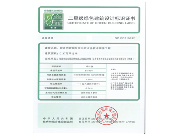 近日,由開發(fā)公司代建的蘇宿園區(qū)派出所業(yè)務(wù)技術(shù)用房工程,順利通過國家二星級(jí)綠色建筑設(shè)計(jì)標(biāo)識(shí)認(rèn)證。