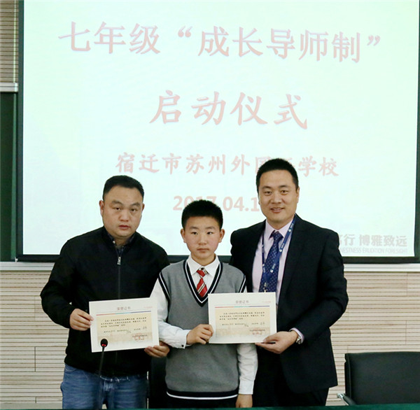 近日,宿遷市蘇州外國語學校七年級16位孩子和他們的家長監(jiān)護人還有他們新認的“干爹”“干媽”齊聚學校階梯教室,舉行隆重的簽約儀式。這些“干爹”“干媽”是學校給首批孩子們配的成長導師,每位教師與一個孩子結(jié)對,全方位關心孩子的成長,陪伴孩子們一起度過快樂而充實的初中生活,力求“個個進步,人人成星”?!俺砷L導師制”這種親情化、個性化、人本化的育人模式,是宿蘇外實施素質(zhì)教育,提升教育核心競爭力的需要;是宿蘇外服務家長,擴大教育品牌影響力的需要;是宿蘇外回報社會,落實“兩聚一高”,建設和諧社會的需要。